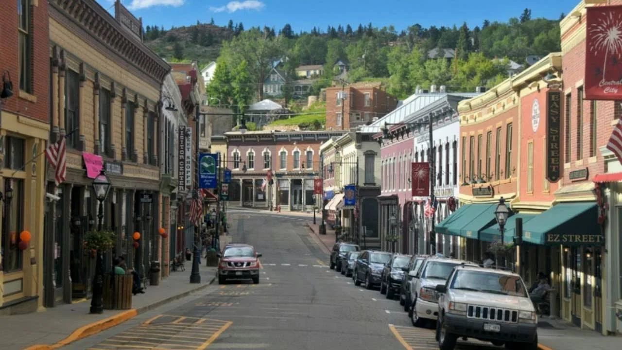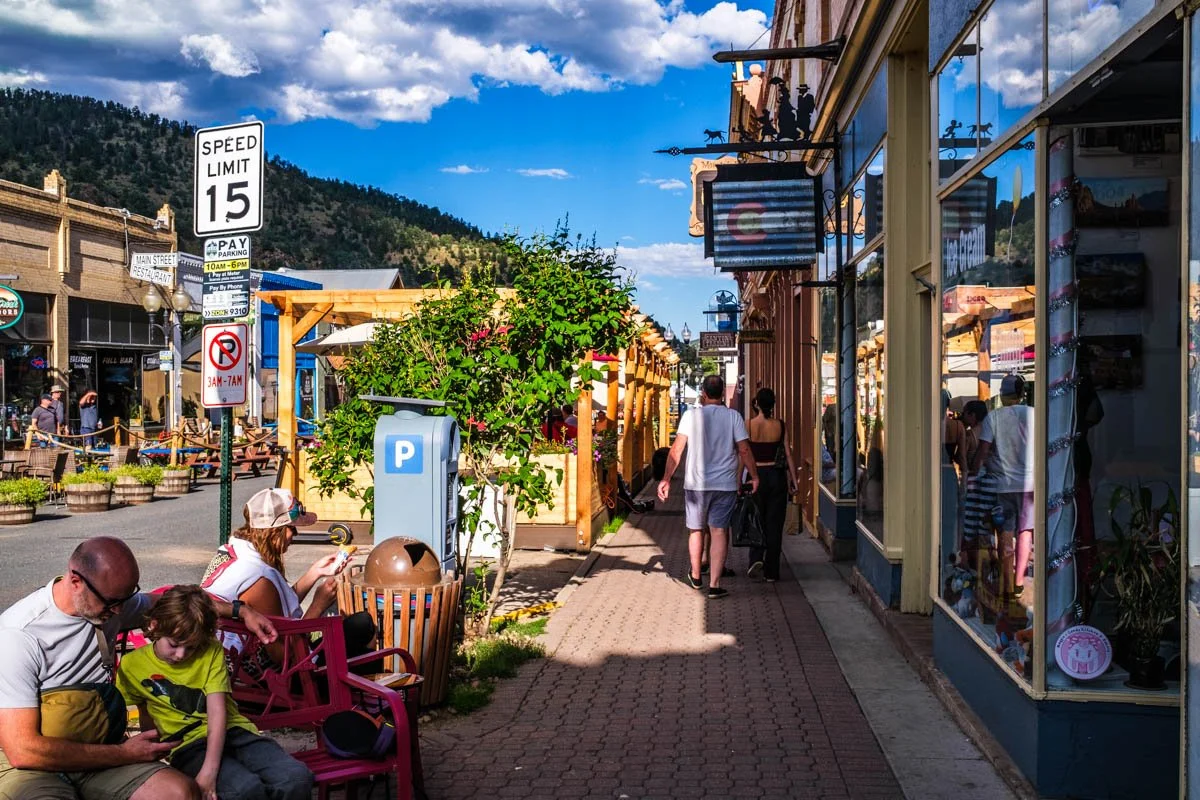 El downtown de Idaho Springs es un pueblo chico de montaña con esa estética americana que se reconoce al instante: fachadas de época, negocios locales, cafés, carteles clásicos, veredas cortas y el ritmo de un lugar que vive a su escala. No es una ciudad montada para turistas: es un pueblo real, con vida cotidiana, y eso se siente.